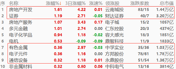 A股市场,房地产开发以1.61%的幅度领涨,其次是证券和房地产服务,其中证券板块也出现在作用涨幅榜前三名之中。涨幅榜前十中,总市值超过万亿的占5席,占比中等,对沪指的带动作用一般。涨幅榜当中,与“电子通信”相关的板块占4席,形成今日的交易主线。A股三大权重板块:银行、酿酒行业、半导体的涨跌幅分别为-1.43%、-0.29%、0.14%,跌多涨少,龙头板块银行股跌幅较深,对A股指数形成严重拖累。