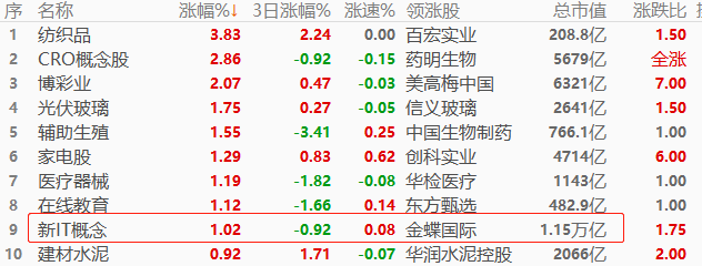 板块角度看,纺织品以3.83%的幅度领涨,其次是CRO概念和**业。涨幅榜前十当中,万亿市值板块占1席,数量极少,对指数的带动作用不强。各个板块之间缺乏内在联系,无法形成当日交易主线。港股三大权重板块:银行、互联网、房地产的涨跌幅分别为-0.08%、-0.58%、-0.5%,普跌但跌幅偏小,对恒指形成一定程度拖累。