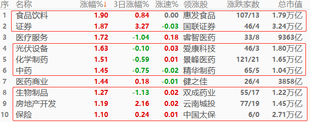 A股市场,食品饮料以1.9%的幅度领涨,其次是证券和医疗服务,其中证券板块已经连续三日位列涨幅榜前三。涨幅榜前十中,总市值超过万亿的占8席,占比极高,对沪指的带动作用极强。涨幅榜当中,与“医药”相关的板块占5席,形成今日的交易主线。A股三大权重板块:银行、酿酒行业、半导体的涨跌幅分别为0.64%、0.87%、-0.56%,涨多跌少,对A股指数形成提振,下午盘有可能逆转上午盘跌势。