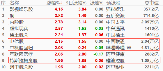 板块角度看,影视娱乐股以4.16%的幅度领涨,其次是铜和内险股。涨幅榜前十当中,万亿市值板块占4席,数量不多,对指数的带动作用不强。以“互联网”相关的板块有4席,形成今日交易主线。港股三大权重板块:银行、互联网、房地产的涨跌幅分别为0.45%、1.56%、0.02%,普涨格局,对恒指形成一定程度提振。