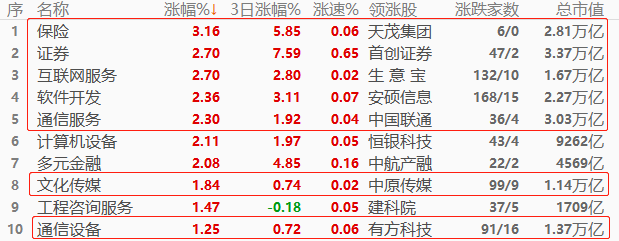 A股市场,保险以3.16%的幅度领涨,其次是证券和互联网服务,其中证券板块已经连续4日位列涨幅榜前三。涨幅榜前十中,总市值超过万亿的占7席,占比极高,对沪指的带动作用极强。涨幅榜当中,与“大金融”相关的板块占3席,且排名靠前,形成今日的交易主线。A股三大权重板块:银行、酿酒行业、半导体的涨跌幅分别为0.2%、0.49%、0.06%,普涨格局,对A股指数形成提振。