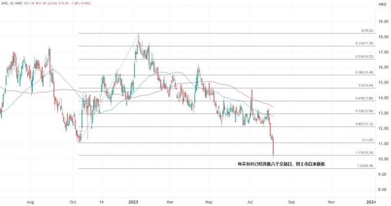 医药股方面,国药(01099)一度跌逾15%,中国中药(00570)和翰森制药(03692)均跌超10%,后者创上市来最低位,为盘中表现最差蓝筹,其上周五收市后公布,收到EQRx终止其与附属有关阿美替尼许可协议的通知。