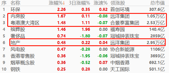 板块角度看,环保以2.26%的幅度领涨,其次是内房股和粤港澳大湾区。涨幅榜前十当中,万亿市值板块仅占3席,占比一般,对指数的带动作用一般。与“地产”相关的板块有3席,形成今日的交易主线。港股三大权重板块:银行、互联网、房地产的涨跌幅分别为-1.15%、-0.54%、0.43%,跌多涨少,对恒指形成一定程度拖累。