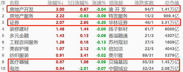跌幅榜前三的板块分别为电机、游戏、计算机设备,跌幅介于1.19%~1.63%之间。