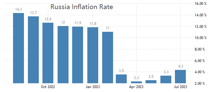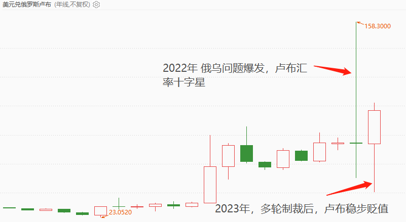 俄罗斯7月CPI年率4.3%,接近公认的温和通胀标准2%~3%区间,高通胀问题并不显著,所以官方加息的理由可信度不高。去年4月份,俄罗斯的CPI年率增速高达17.8%,原因是俄乌问题招致欧美各国多项制裁,物资紧缺情况下价格水涨船高。俄罗斯二季度GDP增速4.9%,高于前值-1.8%,时隔四个季度后重归零轴上方。今年以来,俄罗斯RTS股票指数累计涨幅2.82%,未现严重抛售迹象。综合来看,俄罗斯高通胀问题不严重、宏观经济止跌回升、股票市场信心稳定,唯有卢比汇率表现疲软,持续对美元贬值。