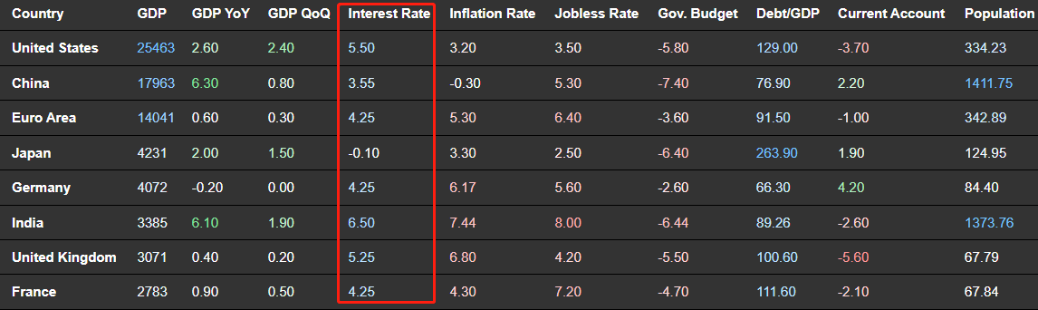 高利率会增加政府债务成本、抬高房地产市场按揭贷款利率、增加上市公司融资成本、降低股市估值。高利率存在的时间足够长,就有可能导致经济衰退的出现。截至目前,全球主要经济体的基准利率维持在3.55%至5.5%之间,均远高于GDP增速。经济衰退预期之下,大宗商品的需求转弱,价格自然无法坚挺,原油也不例外。