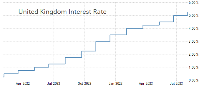 2022年以来,英国央行持续激进加息,基准利率从0.1%飙高至当前的5.25%,翻了50倍有余。高利率可以遏制高通胀,代价是投资和消费需求疲软。对于英国来说,更糟糕的是,高利率并没有实现如美国一般的抑制高通胀作用,反而对消费需求形成严重打击。原因在于,俄乌问题对欧洲经济,尤其是英国经济造成严重拖累。尤其是在能源供应方面,美国可以自给自足,英国却需要寻求石油进口的替代方案,而替代方案意味着更高的用油价格。