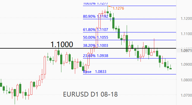 技术角度看,7月18日至今,EURUSD累计跌幅达到3.34%,跌势显著。同期的美元指数从100关口之下飙涨至103关口之上,表现强势。本轮回调波段几乎已经吞没7月中上旬的涨幅。1.0800~1.0834是重要支撑区间,市价越接近该价位,越有可能开启反弹。