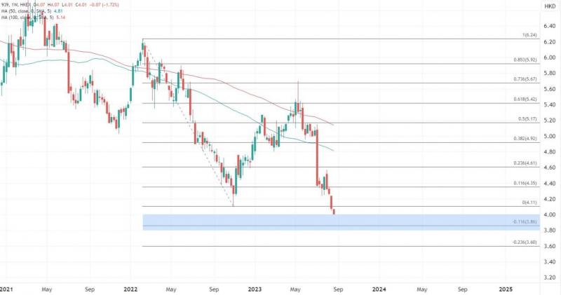 在大型银行中,建设银行(00939)的派息最高,较同业高出0.9厘,2.97的市盈率相较其他四大行更低,不过今年以来的股价跟随大环境向下,创下2009年3月以来最低位。参考以往走势,4.0-3.8港元之间可暂时缓和下行,待业绩指引后看是否有反弹空间。