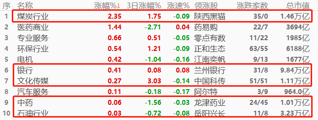 A股市场,煤炭行业以2.35%的幅度领涨,其次是医药商业和专业服务。涨幅榜前十中,总市值超过万亿的占5席,占比中等,对沪指的带动作用偏强。涨幅榜当中,与“能源”相关的板块占3席,形成今日的交易主线。A股三大权重板块:银行、酿酒行业、半导体的涨跌幅分别为0.41%、-1.08%、-1.49%,跌多涨少,对A股指数形成拖累。