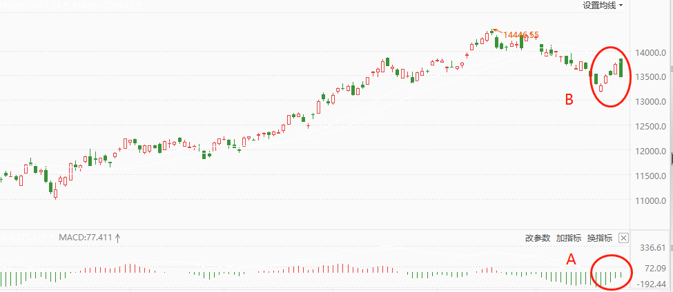 附图指标是MACD,根据A区的柱状图,趋势已经有止跌反弹迹象,柱线很快将翻越零轴。主图当中,B区形成底分形支撑结构,只要市价不跌破B区最低点(13161),则反弹可能一直存在。