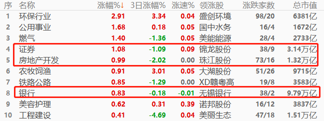 A股市场,环保行业以2.91%的幅度领涨,其次是公用事业和燃气,其中环保行业在昨日位列跌幅榜首,今日具有超跌反弹特征。涨幅榜前十中,总市值超过万亿的占3席,占比一般,对沪指的带动作用一般。涨幅榜当中,与“大金融”相关的板块占3席,形成今日的交易主线。A股三大权重板块:银行、酿酒行业、半导体的涨跌幅分别为0.83%、-1.3%、-2.95%,两跌一涨且跌幅较大,对A股指数形成严重拖累。