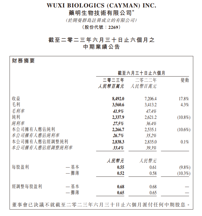 截至今年6月底止,药明生物上半年收入按年升17.8%至84.92亿,期内纯利则按年跌10.8%至23.38亿元。公司指,纯利减少主要由于上半年毛利率按年跌5.5个百分点,至41.9%,加上销售及营销开支、行政开支及研发开支增加,以及资本市场波动导致的投资公允价值损失,宣布不派中期息。
