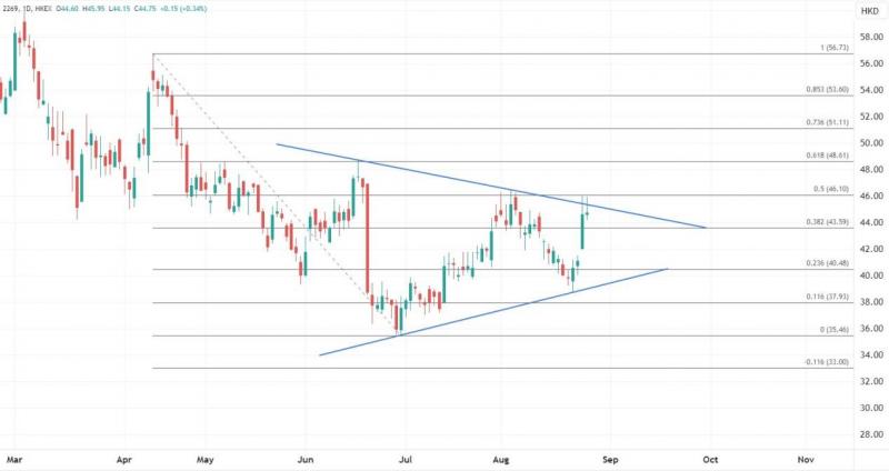 昨日股价创下4月份以来的最大单日涨幅,在自6月份高位以来的趋势线遇阻,该位仍为阻力的情况下,留意向44港元下方调整,不过整理形态底部可以缓和进一步下行至40港元关口下方的压力,主要阻力位于6月高位在48.70港元。