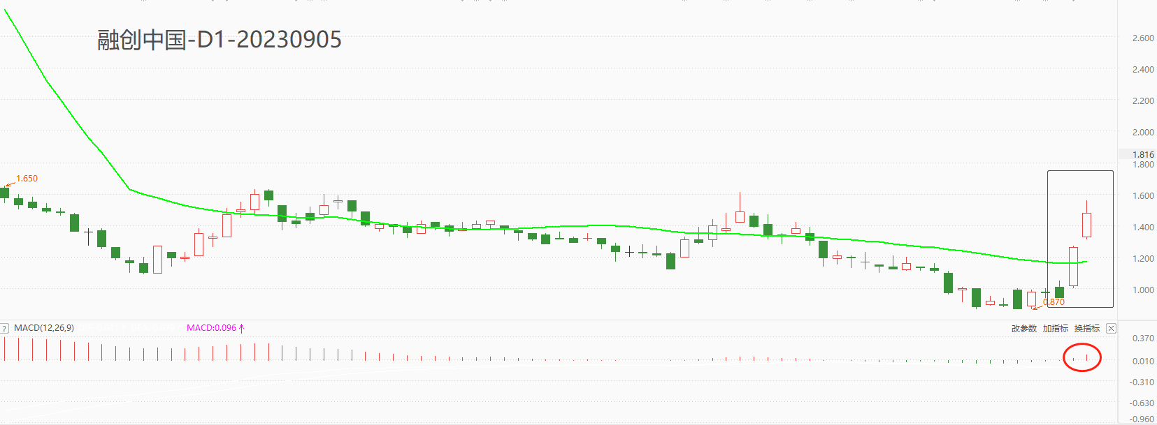 技术角度看,4月14日至8月31日,融创中国股价保持窄幅横盘震荡走势,最高价2.16港元,最低价0.870港元。由于股价绝对值不高,所以较小的价格涨跌就会出现巨大的百分比变化。过去的四个多月,融创中国不乏10%以上的单日波动,比如5月30日15.45%、6月2日上涨12.5%等等。受消息面影响,融创中国日线股价有效突破MA30压制,接下来考验7月31日高点1.61港元的阻力作用是否有效。MACD柱状线穿越零轴,两根柱线处于零轴之上,提示趋势转向可能。但由于红色柱线数量不足,近两日上涨走势仍有回落风险。