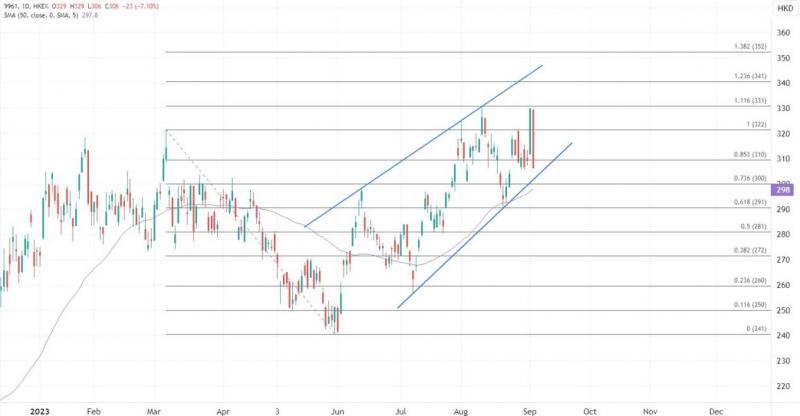 携程股价今年跟随旅游市场的回升获得动力,累计上涨12%。不过绩后携程股价反而倒跌超过6%,部分反映市场对于国内下半年旅游市场受到经济和消费依然较弱的限制。部分则在于技术高位的阻力,股价昨日收于330港元的前高水平,绩后部分资金高位结利,也带动价格自阻力位回落,顺势指向300港元,届时留意50 SMA的支撑。