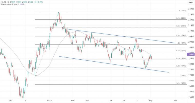 内房股日内成为大市的唯一亮眼板块,午后持续走高,在近期媒体密集发声后,预计各地的宽松组合拳进一步发力,再次吸引资金的关注,不过留意这种短线的资金进场可能是快进快出模式,直至看到楼市回暖的信号。恒指自两周前的反弹在50均线处遇阻后,如果日内收低于18400,本周晚些时候可能再度看低至18000下方。