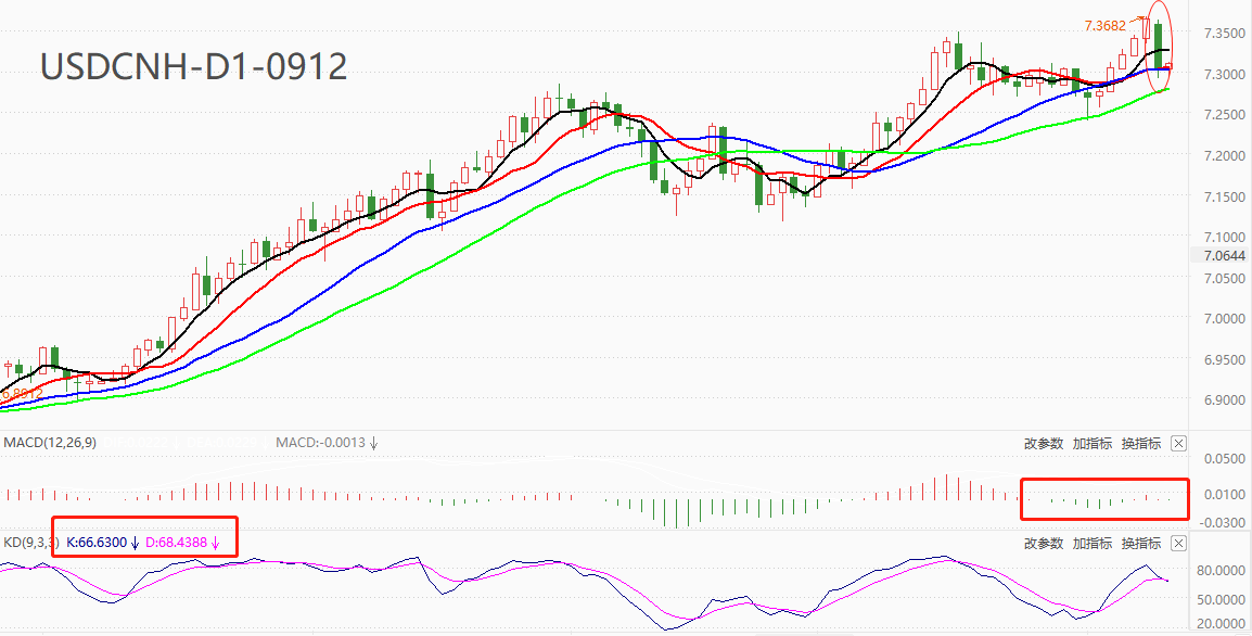 技术角度看,USDCNH最近五根日K线即将形成“顶分形”阻力结构,如果今日收盘价低于7.3682,则短线有可能开启回调。MA均线系统的多头排列遭到破坏,MA10和MA20出现交叉,上涨动能略有不足。8月24日至今,MACD柱线绝对值偏小,表明K线震荡特征强于趋势性特征。KD指标的数值分别为65/68,9月8日K值曾达到80超买线之上,目前处于回落阶段。综合来看,多指标证明USDCNH的多头趋势接近尾声,下跌波段可能即将到来。