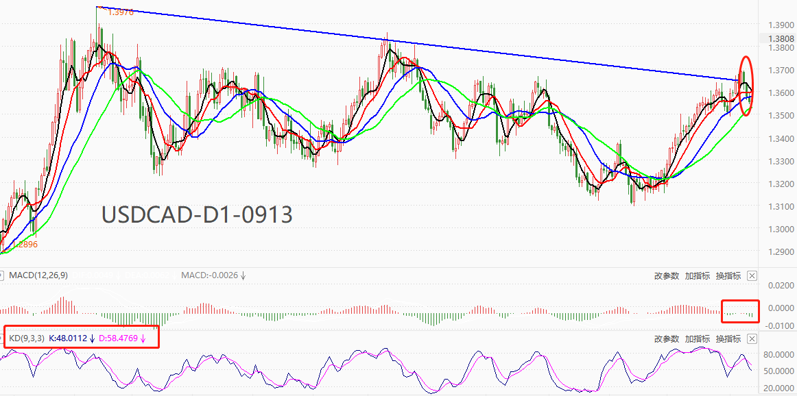技术角度看,USDCAD市价已经运行至长期下降阻力线附近,行情本身面临下行压力,高油价对汇率下跌起到了助推作用。K线尚未突破MA均线系统,目前仅能判断为回调,是否能够趋势反转仍需观察。MACD柱线在零轴之下,但绝对值偏低,空头趋势不显著。KD指标数值分别为48.36/58.2,没有触及超买/超卖的警戒线。综合来看,USDCAD面临较强的下行压力,未来可能跌破长期均线MA30。