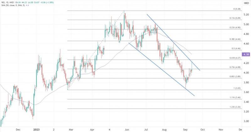 昨日盘中一度涨逾4%的华能国际电力(00902)经过近两周的反弹,向下行通道顶部发起测试后削减涨幅,尾盘涨幅缩减至近2%,技术上在不能突破上述关键阻力的情况下,留意向4.0-3.8港元调整。