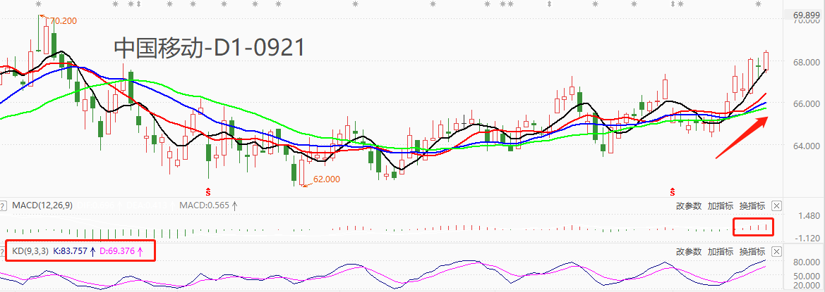 技术角度看,中国移动最近5根K线四阳一十字星,短线涨势迅猛。均线系统多头排列,但多头排列形成的时间不长,虽然中短期趋势偏多,但不够稳定。MACD柱线刚刚由绿翻红,中短期趋势偏多,但仍需进一步观察。KD指标读数分别为84/69,K值触及超买警戒线,D值仍在警戒线下方,表明股价仍存上涨动力,但潜在空间不大。综合来看,大部分指标支持中国移动股价继续上涨,但涨势能延续多久仍存疑,最近的阻力位在5月5日形成的高点70.2港元处,市价在该价位处的K线形态将决定未来涨势的流畅程度。