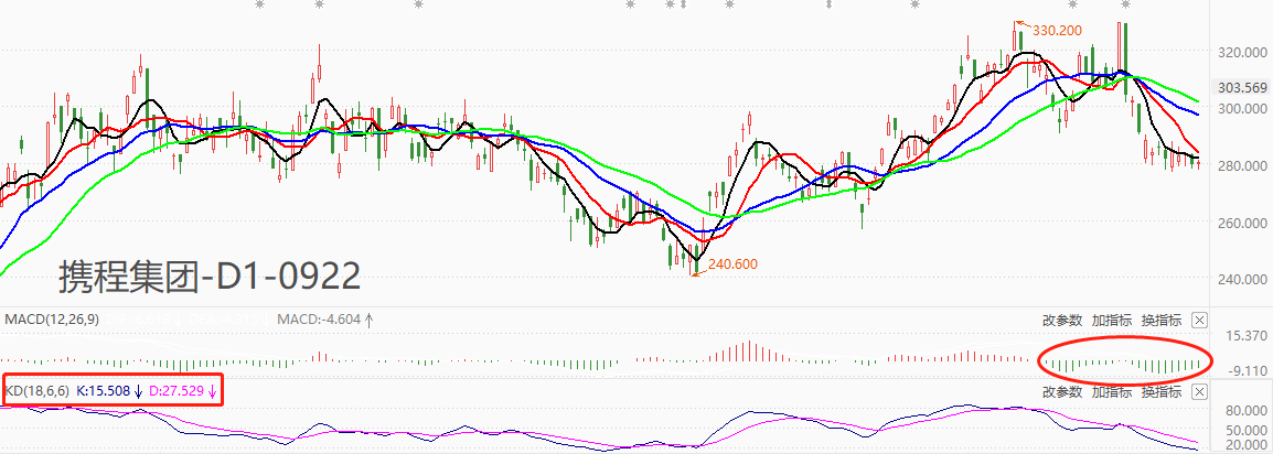 技术角度看,9月11日以来,携程集团日K线保持窄幅震荡态势,区间277~290港元。均线系统向下依次排列,中期趋势为显著空头。MACD柱线长期处于零轴下方,但最近六根柱线呈现出绝对值收缩的迹象,意味着空头趋势力度有所减弱。KD(18,6,6)指标读数分别为15/27,前者达到超卖区间,表明股价存在反弹动力。综合来看,携程集团的中期趋势依旧为空头,但多个指标提示趋势有可能在近期发生转折,潜在的反弹可能性需引起注意。