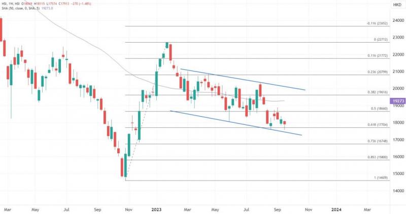 交投清淡的同时,在今日尝试突破前,恒指本周早些时候整体交投区间出现收窄,在市场看来,当前港股依然未到达底部。本周进一步失守18000关口后,恒指本周周线已经提前锁定了下跌,8月低位尽管尚未跌穿,但港股仍可能继续探底,留意今年新低的出现。不过留意技术上在8月低点17574获得支撑会带来短线的反弹空间。