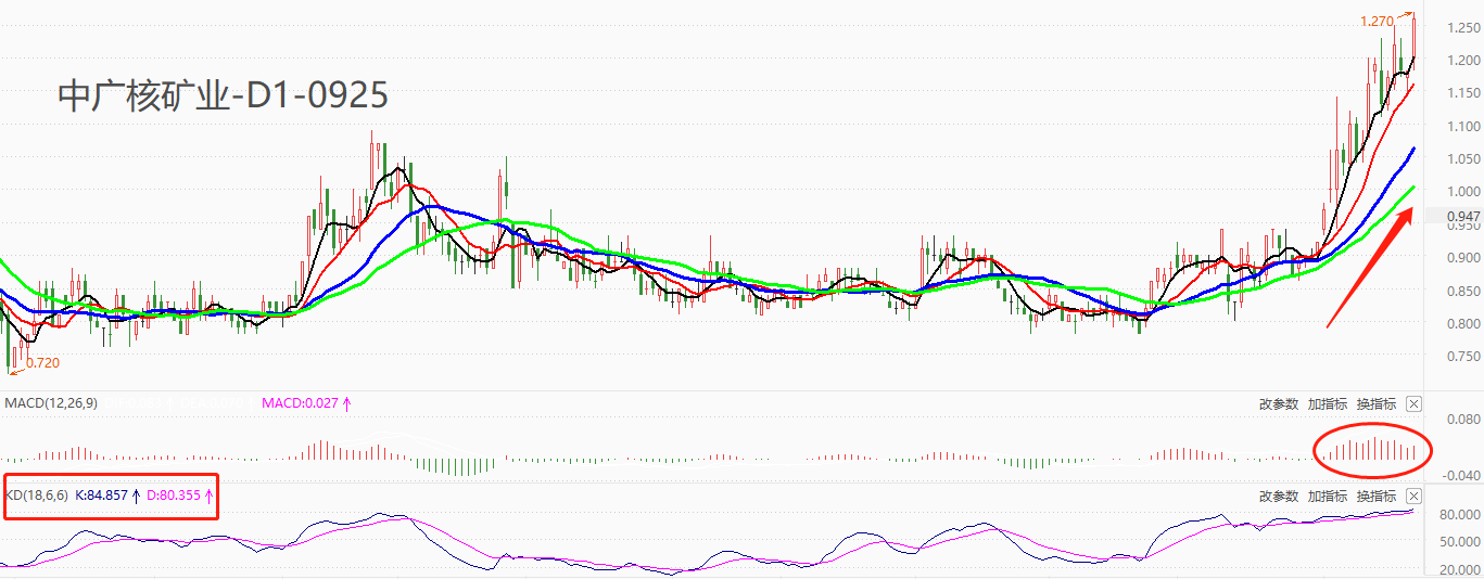 技术角度看,中广核矿业最近五根K线四阳一阴,涨势显著,且阳线幅度都较大,看多热情浓厚。均线系统呈多头排列,均线之间空间较大,发散性强,趋势性稳固。MACD指标的柱状线处于零轴上方,绝对值较大,表明中短期趋势为显著多头。震荡指标KD的读数分别为85/80,已经触及80的超买警戒线,回调走势随时可能出现。综合来看,大部分指标提示多头趋势延续,虽然震荡指标提示回调,但在K线形成鲜明顶部结构之前,不建议持有空头思维。
