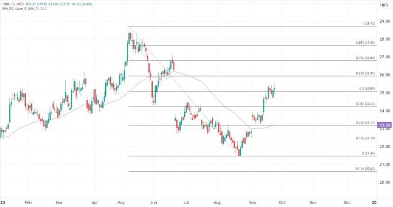 ATFX港股:今日港股未能延续上一交易日强势出现回吐,在为数不多的逆市上涨板块中,煤炭股延续了上周的积极走势。中国神华(01088)股价小幅高开后一度录得逾三个月高位,下一关键阻力在26港元处。