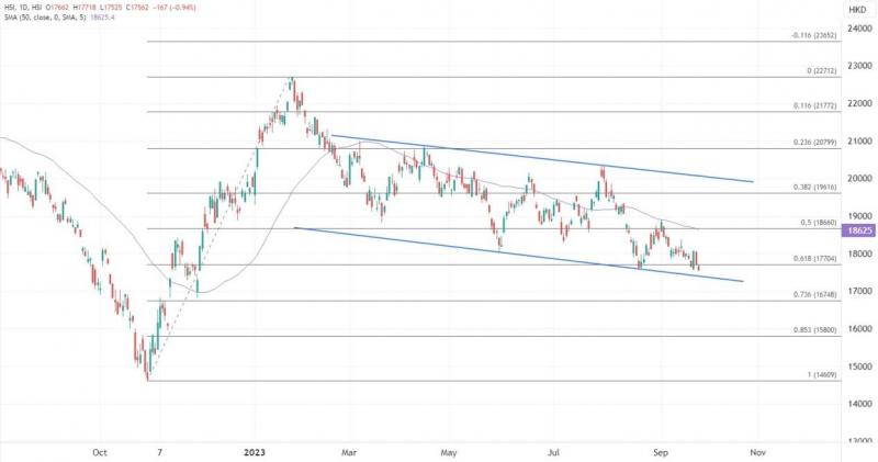 ATFX指,临近内地长假节前港股成交量进一步见淡,今日半日成交不足400亿港元,当前的弱势仍可能持续至节后市场回归,期间留意外围经济报告和美国政府停摆风险的影响。恒指测试日图下行通道底部,如能获得支撑,节前可以关注反弹至18000关口的动能,但站稳其上方寻求更大反弹动力不足,相反关注期间会否下试更低的16750附近的前低支撑。