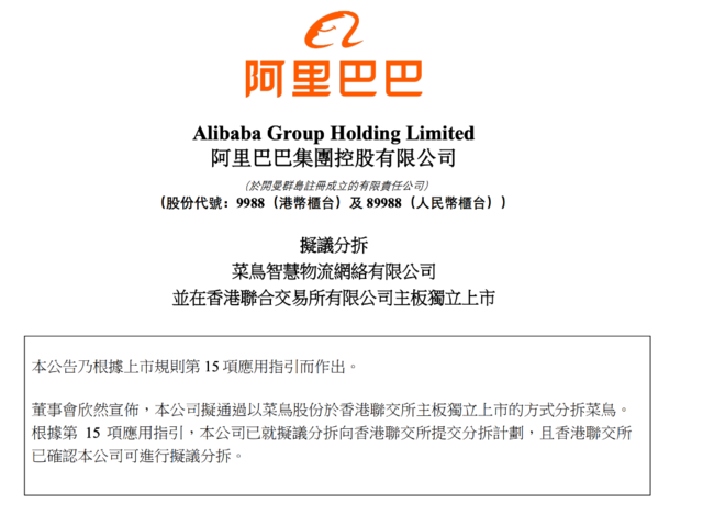 阿里巴巴港股盘后公告,公司拟通过以菜鸟股份于香港联交所主板独立上市的方式分拆菜鸟。现建议,拟议分拆将以菜鸟股份全球发售的方式进行(包括香港公开发售及国际发售)。拟议分拆完成后,公司将继续持有菜鸟50%以上的股份,因此,菜鸟将仍为公司子公司。
