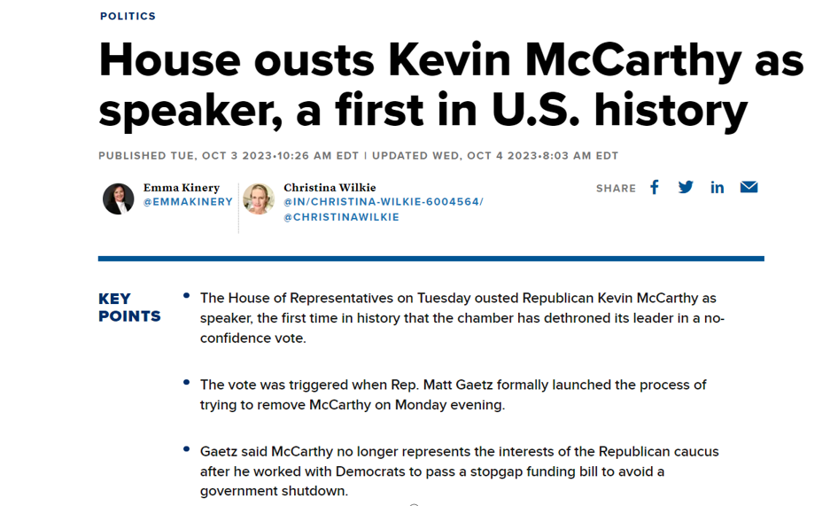 本周三,美国众议院共和党议员举行会议,投票选举新的众议院议长。前任众议院议长麦卡锡由于通过了临时预算法案,受到共和党内强硬派反对,最终于10月3日以216票赞成、210票反对的投票结果被罢免议长职位。美国的党派之争对于美国宏观经济构成负面影响,加重了市场人士对于美国将在今年四季度陷入衰退的预期,利空美元指数,利多贵金属。