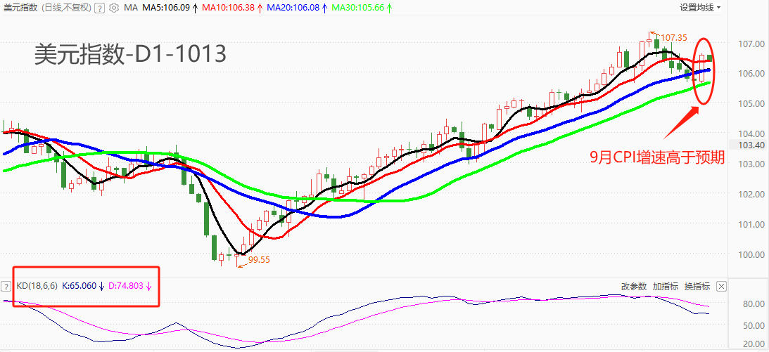 ATFX汇市:周四,美国劳工部公布9月CPI年率增速,最新值3.7%,与前值持平,高于预期值3.6%。名义CPI增速没能如预期一般下降,意味着美联储仍有充足理由在四季度加息。美元指数受到明显提振,昨日涨幅0.79%,最高触及106.61点,K线组合形成经典的“一阳吞三阴”结构,表明短线涨势强烈。不过,9月核心CPI年率增速从4.3%降低至4.1%,意味着导致名义CPI增速升高的影响因素是能源和食品价格。对于美联储来说,核心CPI的指导意义更强,不排除票委们根据核心CPI数据表现得出“通胀下行,停止加息”的结论。