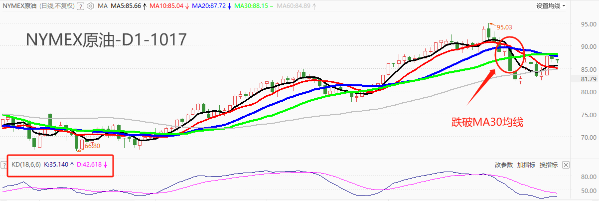 技术角度看,NYMEX原油最近五根K线三阴两阳,市价横向运动,震荡特征显著。作为多空转折标准的MA30已经在10月4日被跌破,当前市价再次运行于MA30附近,如果无法重归MA30上方,则日线级别形成“回踩确认”信号,NYMEX的中期走势偏空。中期均线MA20已经向下突破MA30长期均线,中长期趋势面临由多向空的转折。KD指标的读数分别为35/42,距离超卖线20仍有一段距离,跌势仍可延续。综合来看,多数指标指向NYMEX多头趋势终结,空头趋势开启,这与宏观面的判断相互矛盾。