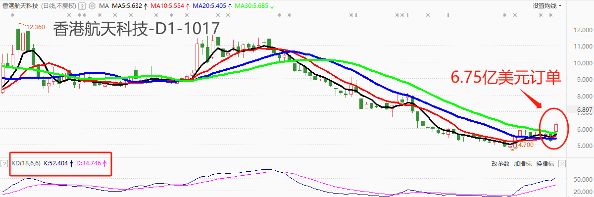 ATFX港股:昨日,港股市场工业工程板块的香港航天科技发布公告称:2023年10月16日,本公司与Alya订立Alya-1系统合约,合约总价为约6.75亿美元,预付款500万美元,余额依照进度依次支付。2022全年,香港航天科技营收总额6.354亿元,不及昨日签订合约的总价值。如果产品能够顺利交付,香港航天科技的业绩数据或将翻番。受此影响,香港航天科技股价开盘跳涨11.09%,至今日11.07%,涨幅18.55%,盘中最高触及6.35港元。回归历史行情发现,香港航天科技上市以来的最高价出现在2021年4月26日,达到50港元整,至今的两年半时间里,没能再创新高。新订单公告之前,股价已经出现7%左右的涨幅,而此前是持续数月的漫长跌势。