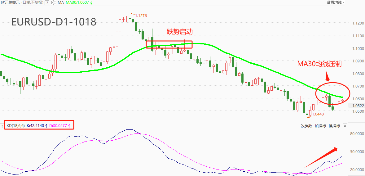 技术角度看,EURUSD最近五根K线两阴三阳,整体结构呈V型,震荡特征显著。市价处于MA30均线附近,由于当前为空头趋势,所以均线压制EURUSD涨势的可能性较高。如果上破MA30的努力失败(标志是没能实现连续三根K线收盘价在均线上方),则汇率有可能迅速下行。震荡指标KD的读数分别为42/30,处于由超卖区间向超买区间的向上运动过程中,意味着短期的反弹仍将持续一段时间。综合来看,技术指标之间没有给出统一的方向,意味着市场行情处于临界状态,即可破位上涨,也可重启跌势。