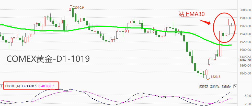 技术角度看,COMEX最近五根K线四阳一阴,阳线振幅远大于阴线,短线涨势迅猛。10月13日,长阳线有力地的突破MA30均线,中期趋势存在转折可能。由于历史K线曾反复穿越MA30,这次可能出现走势重复,所以对本轮上涨波段的最终涨幅还不可过于乐观。震荡指标KD的读数分别为63/40,距离80的超买区间仍有一段距离,涨势仍能延续一段时间。综合来看,多数指标提示黄金多头仍将延续,但继续上行的空间可能比较有限。