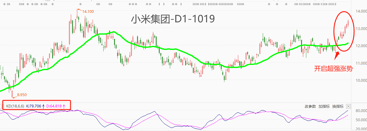 技术角度看,小米集团最近五根K线四阳一阴,且每根K线都在刷新近期高点,短线涨势极为迅猛。10月10日开始,市价站上MA30;10月17日,市价突破半年内最高点。MA30均线可以作为股价的中期支撑,被有效跌破之前均将维持涨势。震荡指标KD的读数分别为79/64,曲线正从超卖区间向超买区间运动,尚未触及80超买线,涨势仍能维持一段时间。如果曲线进入超买区,则股价随时面临高位获利盘的抛压。综合来看,多数指标提示小米集团的股价仍将上涨,以目前的上涨节奏看,下周市价有望创出年内最高。
