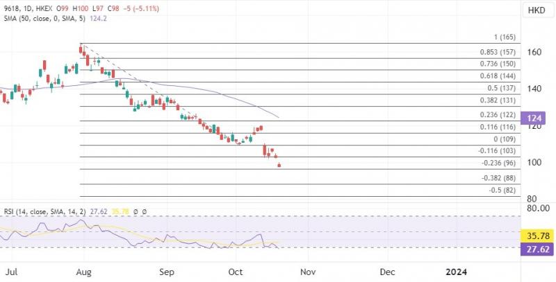 京东股价自8月份以来已经多次破底,10月13日,京东港股股价遭遇今年以来最大跌幅,自1月份以来,股价跌幅已经超55%,当前在100港元下方预计有更多跌势跟进,目标在80港元下方,但留意技术上过度修正后可能伴随反弹。