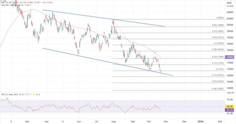 ATFX港股:昨日港股重阳节假期休市,期间外围及内地股市表现向下。恒指连跌三日累挫601点创今年收市新低后,今早再挫近300点,失守一万七千点关口,创2022年11月底以来新低。