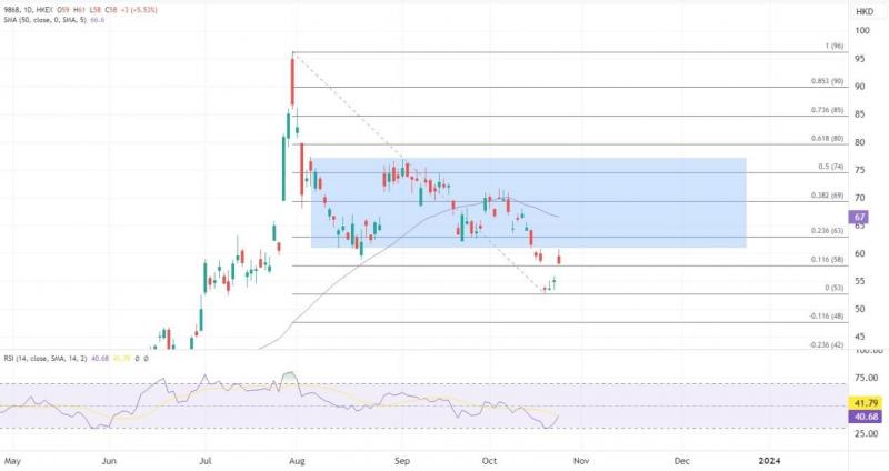 今早小鹏股价急涨后部分回吐,如果日内坚守在60港元上方,则回到自8月份以来的主要区间模式内,可以寻求进一步向63至65港元阻力位的反弹,53港元作为近期底部继续充当支撑。