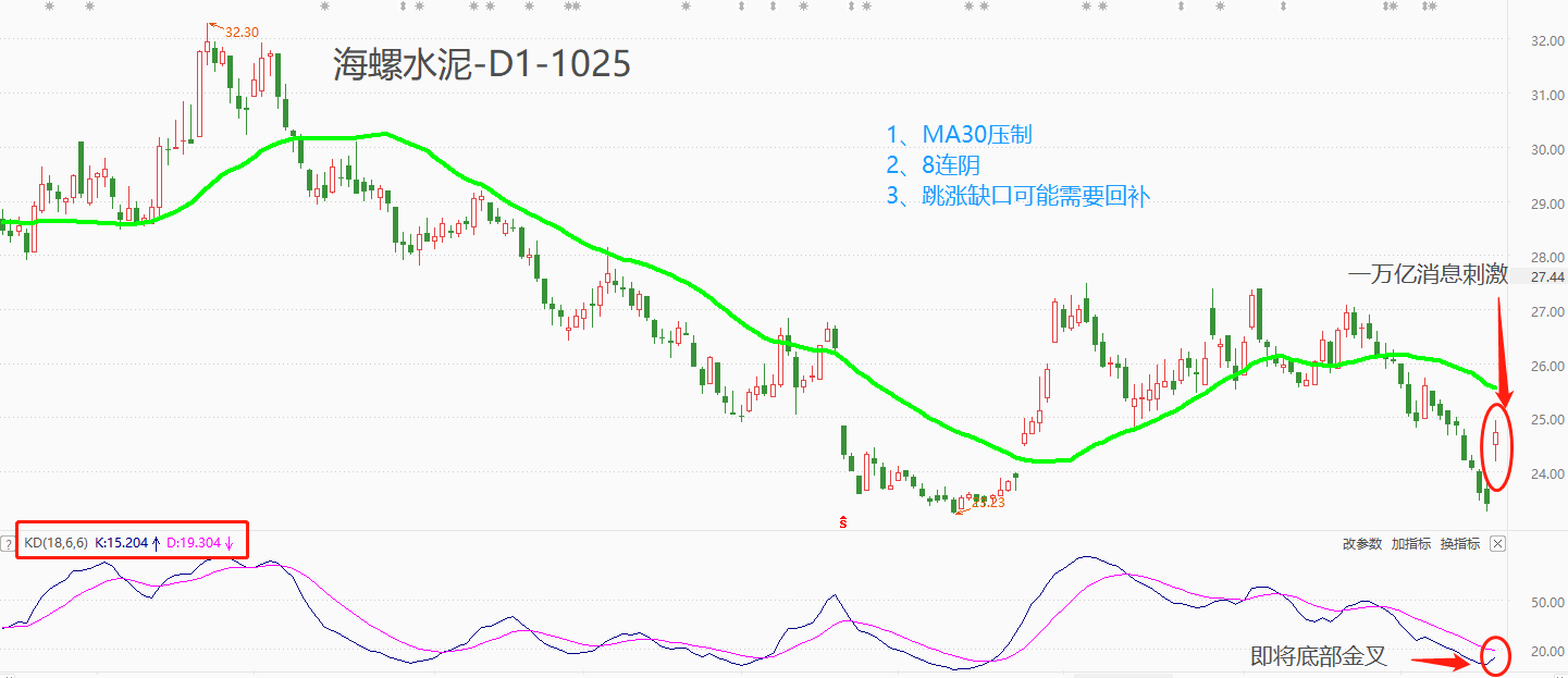 技术角度看,海螺水泥刚刚经历一波迅猛的下跌行情,甚至出现连续8根阴线的局面。虽然今日收到一万亿国债的消息刺激,但反弹能否持续仍有不确定性。市价上方的绿色MA30是强力压制,反弹波段势必要经过MA30的考验之后才能转变为上涨趋势。震荡指标KD即将在20超卖线之下形成黄金交叉,一旦交叉形成,意味着短线涨势确立,市价反弹至MA30附近的可能性将大增。今日跳涨形成的缺口可能需要回补,但回补的时间可长可短,长的时候甚至可以达到一年之久,所以暂时不用担心回补缺口所造成的抛盘压力。