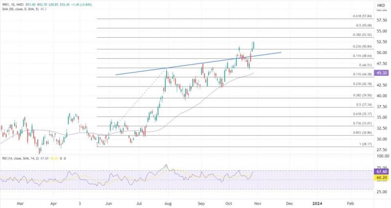 ATFX港股:受业绩强劲的提振,新东方股价周四高开近5%后扩大升幅破顶,一度大涨9%。业绩亮眼主要受益于供给出清和需求复苏,新东方在素质教育、直播电商领域表现亮眼,布局文旅等业务。
