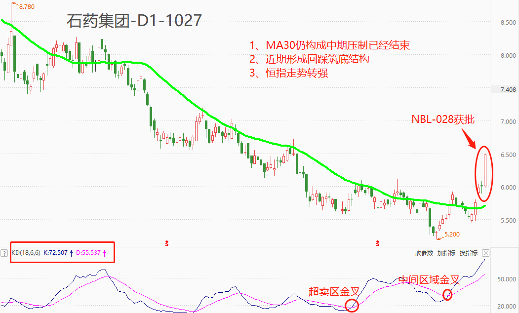 技术角度看,石药集团存在筑底反弹的显著特征,10月5日至20日K线形成“回踩结构”,确认了底部的存在。10月21日开启的反弹走势,已经突破MA30均线压制,且收盘价连续三个交易日位于MA30上方,确认有效突破。震荡指标KD的读数处于中间预期,上涨空间仍然存在。KD指标在8月28日形成超卖区金叉,当日收盘价5.9港元,至今没有形成超买区死叉,暗示多头将会延续。恒生指数虽然处于显著的空头趋势,但今日开盘跳涨,上午盘表现强势,石药集团受一定程度提振。
