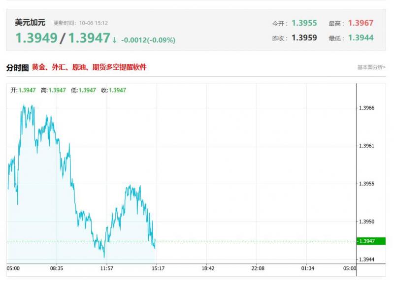 美元兑加元今日汇率最高1.3949 ,最低1.3947 ,涨跌-0.0012 ,涨跌幅-0.09% 。