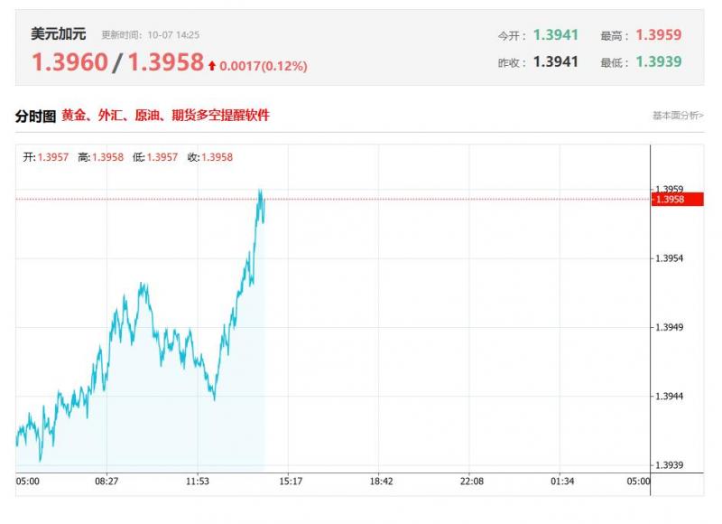 美元兑加元今日汇率最高1.3960 ,最低1.3958 ,涨跌0.0017 ,涨跌幅0.12% 。