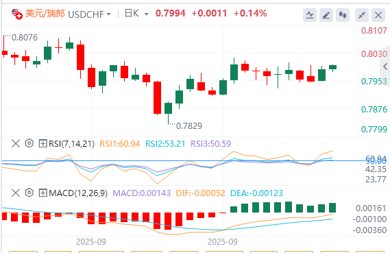10月8日,周三亚洲早盘,美元/瑞郎交投于0.7994附近,下行空间受到20日简单移动平均线(SMA)0.7951和50日移动平均线0.8008的限制。