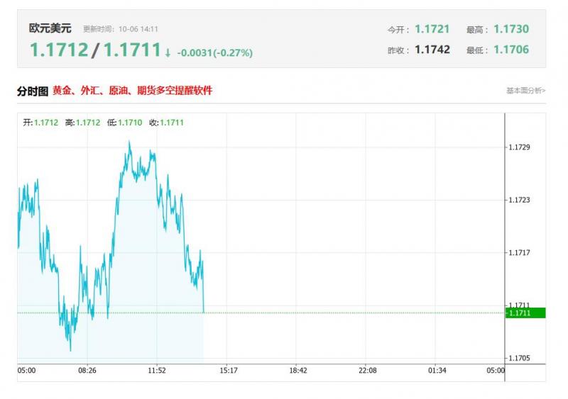 欧元兑美元今日汇率最高1.1712 ,最低1.1711 ,涨跌-0.0031,涨跌幅-0.27% 。