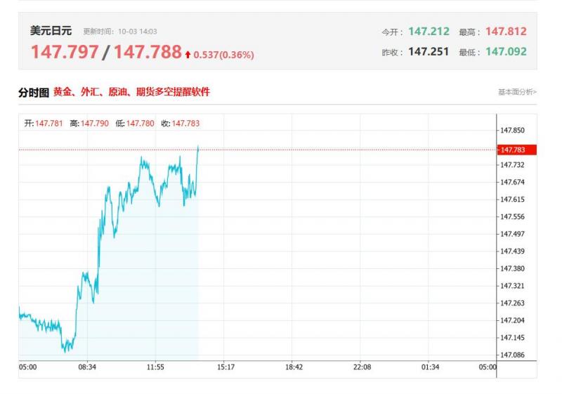 美元兑日元今日汇率最高147.797 ,最低147.788 ,涨跌0.537 ,涨跌幅0.36% 。
