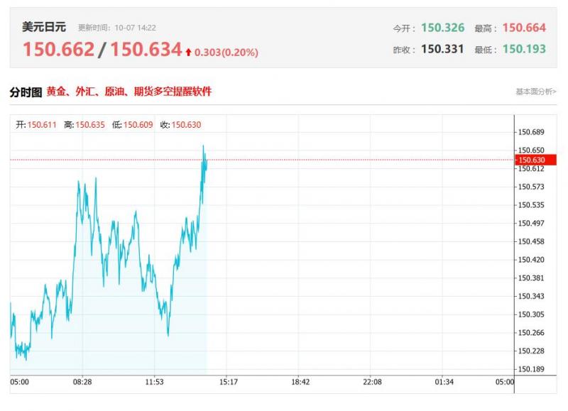 美元兑日元今日汇率最高150.662 ,最低150.634,涨跌0.303 ,涨跌幅0.20% 。